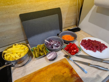 Мясо обмойте и хорошенько обсушите бумажными полотенцами. Нарежьте его брусочками, как на обычный гуляш. Обратите внимание на то, что мясо нарезается поперек волокон, чтобы при жарке оно оставалось мягким.