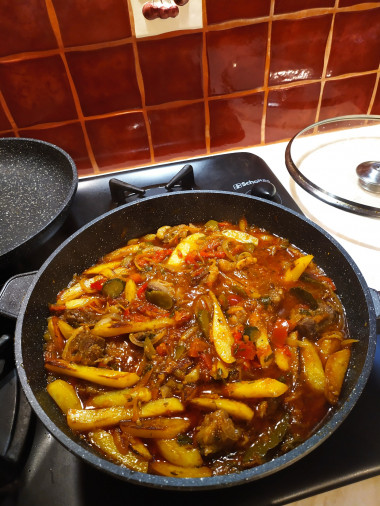 Азу получилось очень вкусное, чем то напоминает из детства вкус рагу с капустой. Я добавила один салатный перец. Действительно с картошкой интересно. На второй день добавила немного воды и прокипятила а после добавила кускус чтоб покрыло всё Азу, закрыла крышкой и через 3 минуты мы кушали. С кускус другой вкус. И так вместо двух порцый получилось 4.