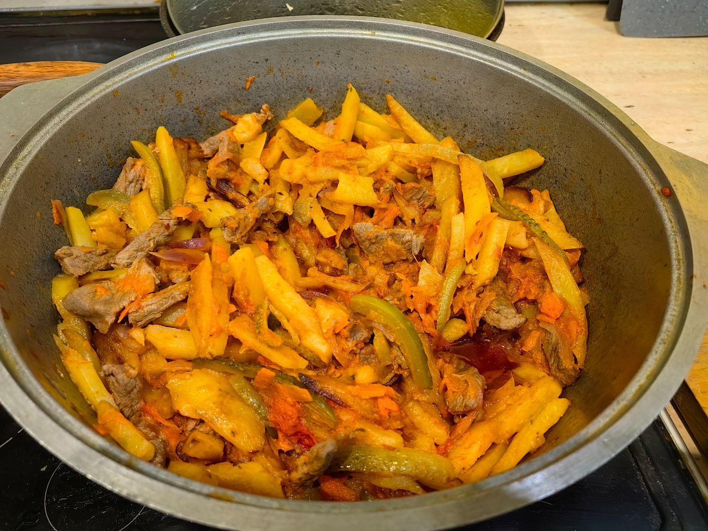 Классное блюдо. Сегодня готовил, правда в казане и с небольшим отклонением- картошку жарил альденто, а когда закинул, перемешал и дотушил ещё 10 минут. Из специй добавлял перец, паприка, кориандр, и чучуть розмарина и кумина. Получилось изумительно))) Спасибо за рецепт!