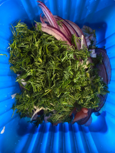 Лук нарезаем полукольцами, чеснок выдавливаем через пресс, укроп мелко режем.