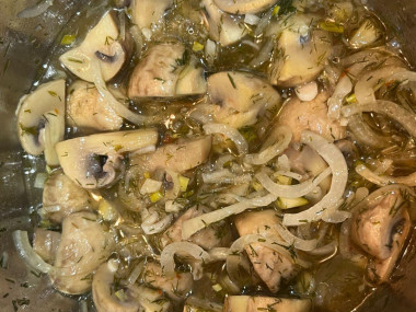Когда вся жидкость испарится из грибов, вливаем прям в сковородку маринад, тушим под закрытой крышкой на очень слабом огне примерно 10 минут.