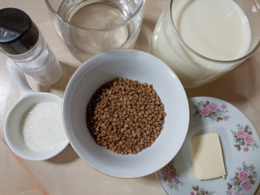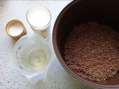 Как сварить гречневую кашу на молоке в мультиварке? Подготовьте продукты. Молоко подойдет любой жирности. Я для варки в мультиварке использую ультрапастеризованное, чтобы оно не свернулось при приготовлении. Количество соли и сахара регулируйте по своему вкусу.