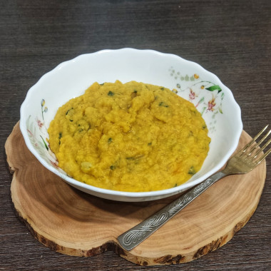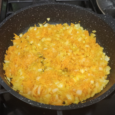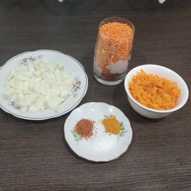Лук порезала мелкими кубиками, морковь натерла на мелкой тёрке. На сковороде слегка потомила специи( паприку и куркуму). Затем добавила лук с морковью и обжарила недолго. Далее добавила чечевицу , воду,посолила,перемешала и оставила тушиться до готовности чечевицы. В конце приготовления добавила измельченную зелень петрушки.