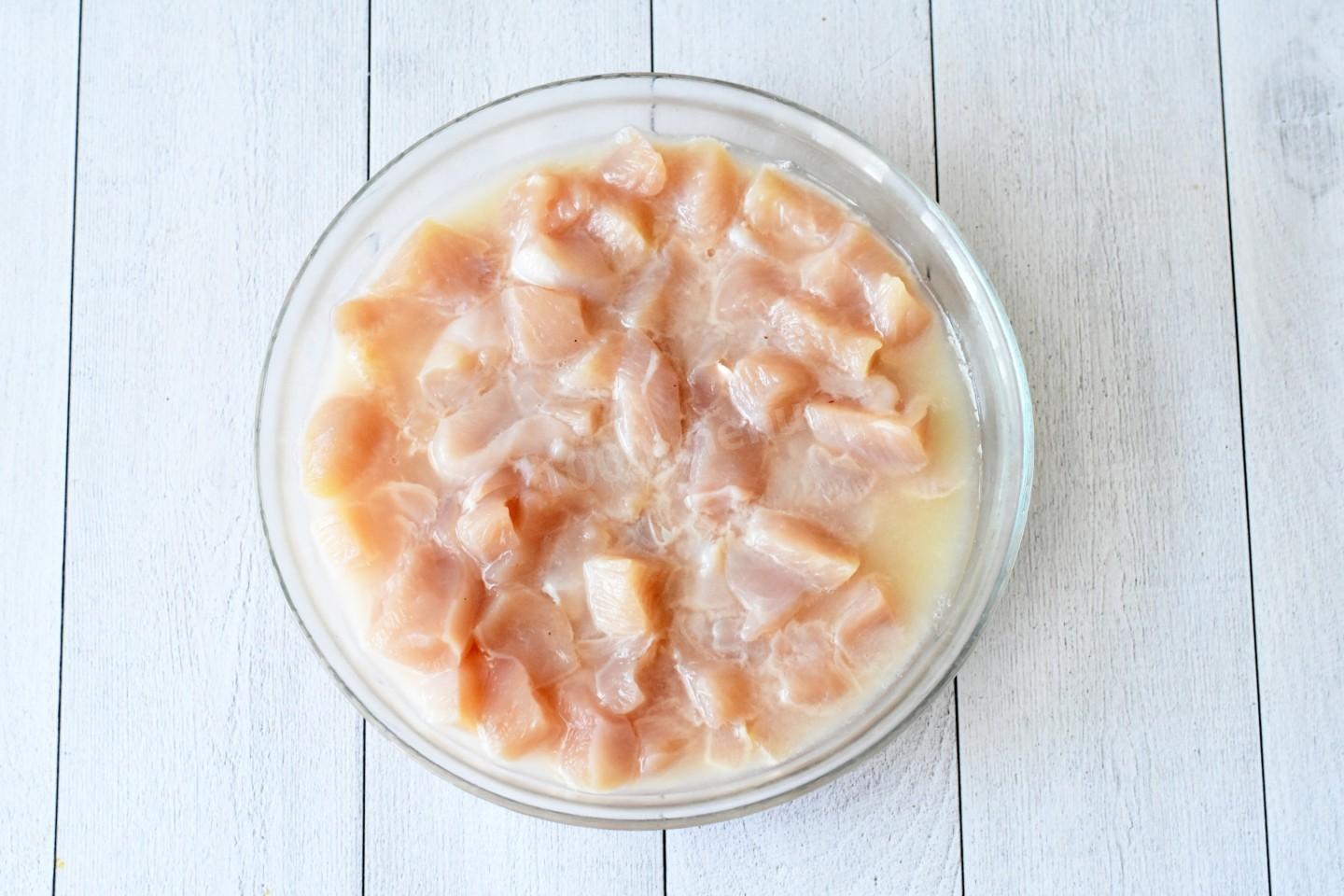 Куриное филе заранее разморозьте вымойте, обсушите и нарежьте небольшими кусочками. Влейте к мясу рассол от оливок. Оставьте курицу мариноваться на 1 час. Затем маринад слейте. А все секреты правильной разморозки вы найдете в статье под шагами.Шаг 3. Как обжарить куриное филе?