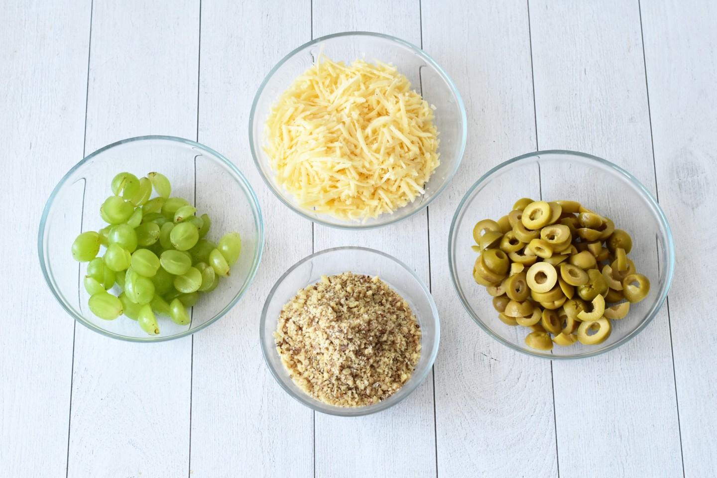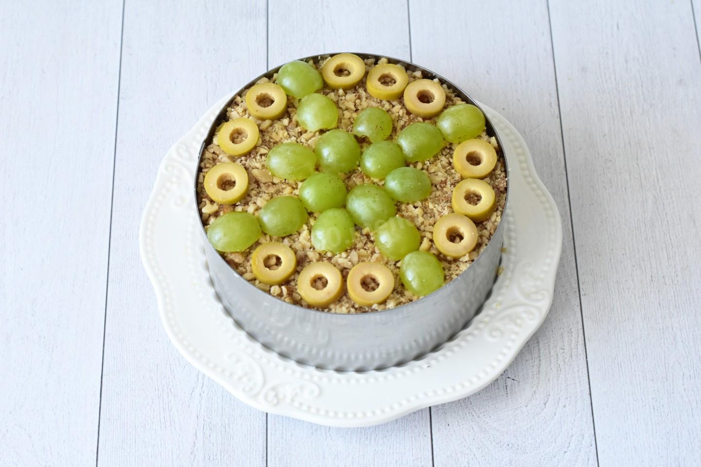 Сыр натрите на крупной терке. Сыр подойдет твердый или полутвердый, качественный, без заменителей молочных жиров. Грецкие орехи прокалите на сухой сковороде и порубите ножом или измельчите в блендере. Грецкие орехи можете заменить на арахис. Оливки нарежьте колечками. Виноград промойте и обсушите. Каждую виноградину разрежьте пополам и удалите косточки. Виноград можете брать любого цвета. О выборе сыра и работе с кухонной теркой читайте под шагами.Шаг 5. Как выложить салат с курицей и сыром слоями?