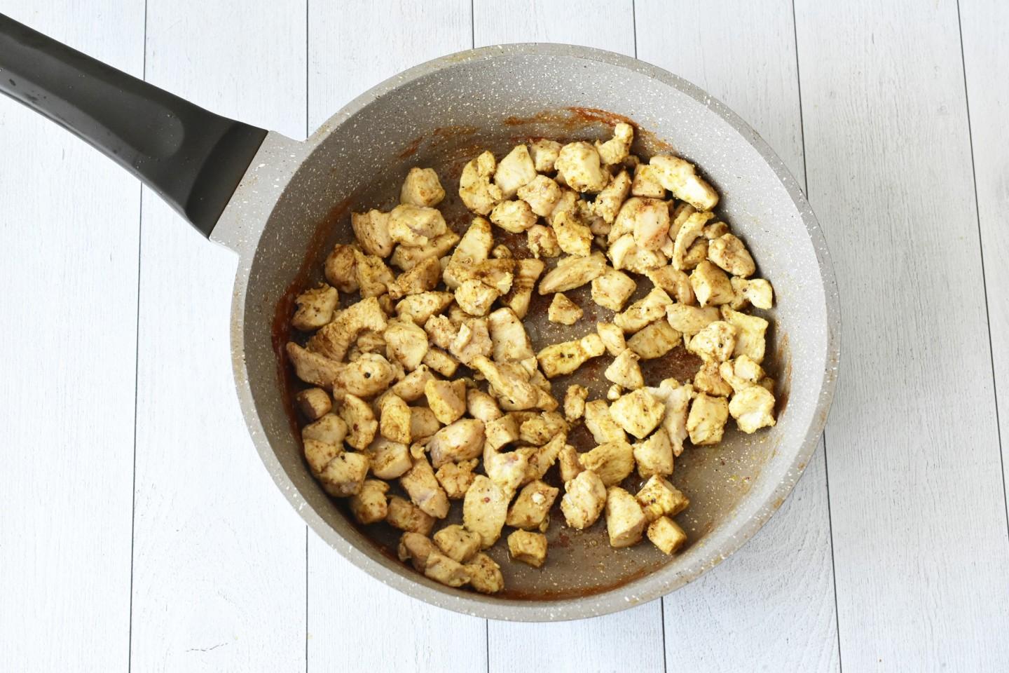 В сковороде на среднем огне разогрейте растительное мясо. Его количество указано примерно и зависит от объема сковороды. Выложите курицу и обжарьте до румяной корочки. В процессе курицу посыпьте специями. Курицу снимите с огня и охладите. Куриное филе можете также отварить в кипящей подсоленной воде или запечь в фольге в духовке до готовности. Подробнее о выборе сковороды и масла для жарки - в материалах по ссылкам ниже.Шаг 4. Как подготовить остальные ингредиенты для салата?