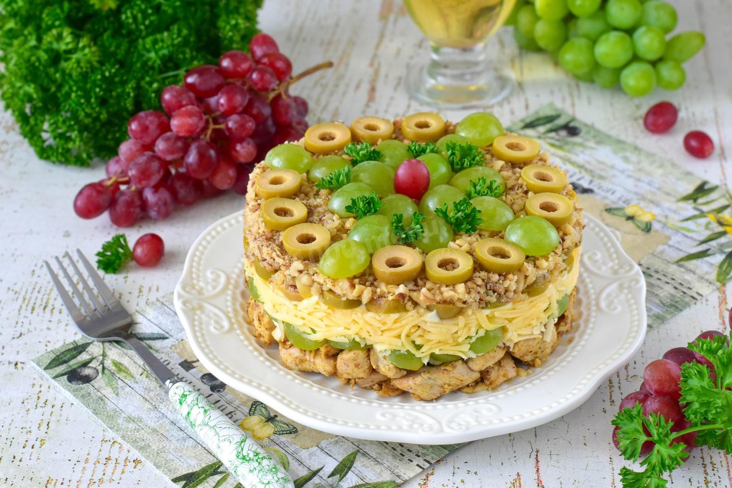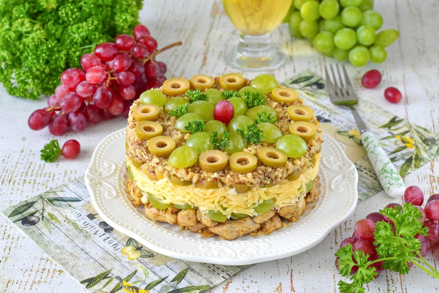 Салаты с виноградом и орехами пришли к нам из европейской кухни. Во Франции популярен салат с курицей, виноградом и грецкими орехами под соусом из сметаны и горчицы. В Италии добавляют сыр горгонзолу и грушу. Наш рецепт — адаптированная версия, где вместо сложных соусов используется майонез, а пикантность добавляет рассол от оливок. Просто, но со вкусом ресторанного блюда.