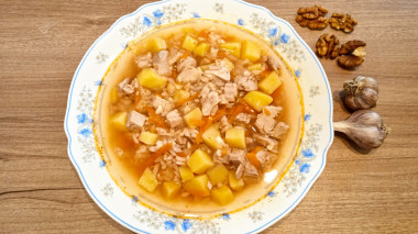 Проварите все вместе еще минут 5-7 и снимите кастрюлю с огня. Добавьте немного измельченной зелени. Готовый классический суп Харчо из свинины с рисом и картофелем разлейте по тарелкам и подавайте к столу в горячем виде. Приятного аппетита!