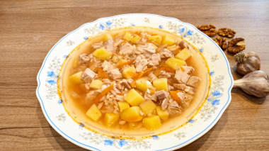 На обед приготовила суп харчо из свинины с рисом и картошкой классический. Бульон сварила из 1 кг мяса на 4 л воды. Бульон готовился 1,5 часа.