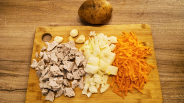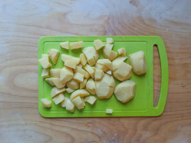 В кипящий бульон добавьте картофель, нарезанный на кусочки.