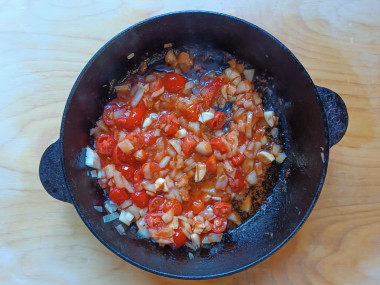 Затем добавьте в сковороду мелко нарезанные помидоры и томатную пасту. Всыпьте все подготовленные специи. Именно они зададут основной вкус готового супа. Кстати, помидоры можно измельчите до состояния пюре или сделать как у меня. Перемешайте. Обжаривайте все вместе еще 2-3 минуты.