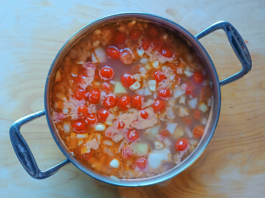 Рис добавила круглозерный. Томатную пасту заменила на кетчуп. Обычные помидоры заменила на черри. Разрезала их пополам. Помидорки были кисловатые, поэтому добавила в суп еще столовую ложку сахара. Хмели сунели у меня не было, поэтому из специй добавила только соль и перец.