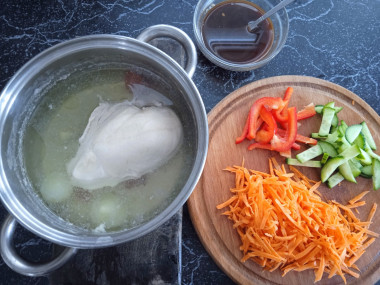 После закипания посолите курицу и варите на среднем огне 20-25 минут. После чего достаньте курицу и охладите. Бульон, как и овощи, больше не понадобятся.