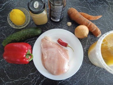 Приготовила корейский салат с огурцами и курицей по этому рецепту. От себя ещё добавила в салат болгарский перец и белый кунжут. Куриное филе сварила с добавлением чеснока, лука и острого стручкового перца. Пока оно остывало, порезала огурцы и сладкий перец соломкой, морковь потёрла на корейской тёрке, лук нарезала полукольцами. Овощи пустили сок, промыла по описанию в рецепте и соединила с курицей. Для заправки смешала мед, горчицу, лимонный сок и соевый соус. Остального у меня нет) Перед подачей заправила салат и в порционных тарелках посыпала кунжутом и хлопьями перца чили. Корейский салат очень красиво смотрится и пахнет классно. Вкус у салат пикантный, островатый, насыщенный.