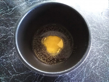Пересыпьте крупу в чашу мультиварки. Влейте в нее воду. Если вы нальете воды в пропорции 1:3 (на 1 часть кукурузной крупы 3 части воды), то каша получится густой и вязкой. Если же в пропорции 1:4, то каша выйдет жидкой. Я варила более жидкий вариант. Всыпьте сахар и соль. Их количество вы также можете менять по своему вкусу.