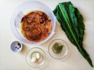 4. Пришло время разложить грузди по банкам. Для этого приготовьте приправы. Чеснок и хрен очистите, порежьте на пластинки. Приготовьте перец горошком и лавровый лист. Промойте смородиновые листья. Можете взять ещё листья дуба.