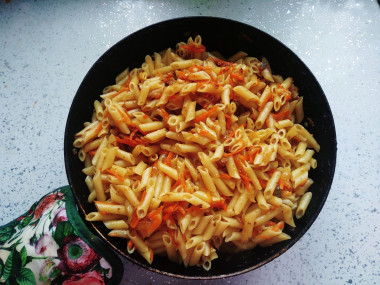 Чтобы сделать блюдо более интересным, добавьте к овощам протертые томаты, тогда получатся макароны с томатно-мясным соусом, по типу болоньезе.