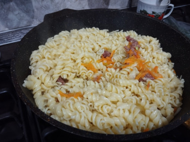 Форма у макарон может быть любая, выбирайте на свой вкус. Только если захотите сварить спагетти, то лучше не смешивайте их с тушенкой на сковороде. Сначала положите в тарелку макароны, а сверху на них мясо.