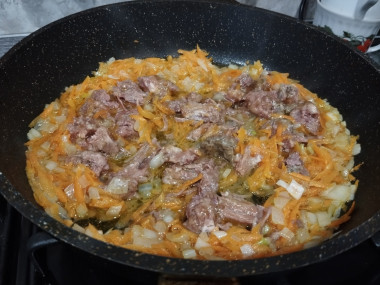 Добавьте в сковороду тушенку. Предварительно можете разломать мясные кусочки на более мелкие части. Жарьте тушенку с овощами еще около 7-10 минут. Можете накрыть сковороду крышкой и убавить огонь, чтобы овощи стали мягкими.