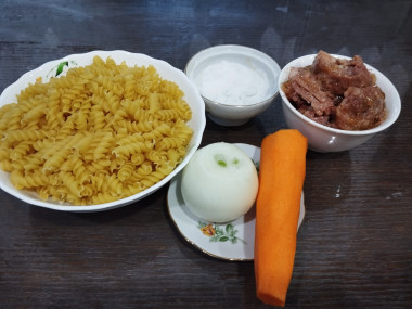 Как сделать макароны с тушенкой на сковороде? Подготовьте продукты. Тушенка у меня говяжья, но вы можете взять любую другую. То же с макаронами - не имеет значения, какие вы возьмете. Морковь хорошо вымойте и обсушите салфетками.