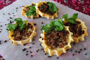 Переложите заготовки на противень, выстеленный пергаментом, и начините остывшим фаршем (по 1 столовой ложке). Яйцо разбейте в отдельную миску, влейте молоко, слегка взбейте венчиком. Залейте полученной смесью перепечи - по 2 столовые ложки в каждый.