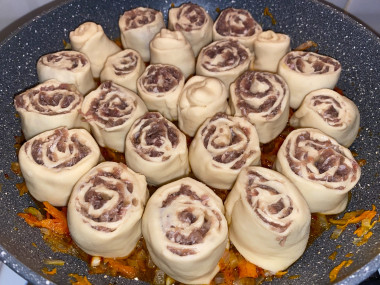 Выложите на зажарку получившиеся рулетики, располагая их срезом вверх. В мою сковороду диаметром 24 см поместилось 20 пельмешек - полностью вся порция из двух рулетов.