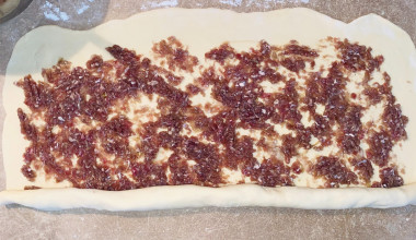 Перемешайте фарш до однородности. Если он у вас получился сухой, то добавьте немного воды. Так начинку будет удобно размазывать по тесту.