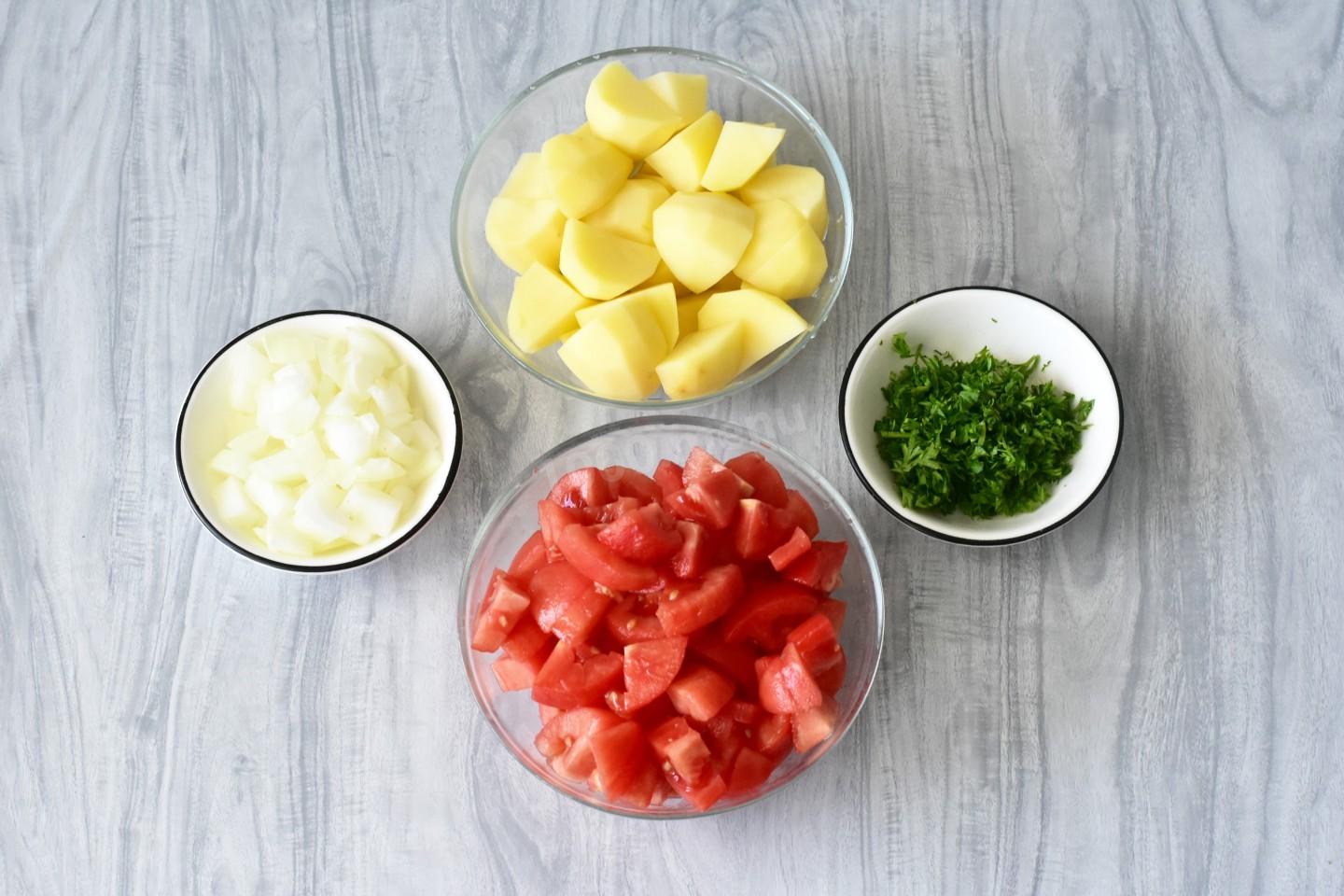 Овощи тщательно вымойте под проточной водой с помощью щётки или жесткой мочалки. Картофель очистите и нарежьте небольшими кубиками. Помидоры ошпарьте кипятком и снимите кожицу. Мякоть нарежьте небольшими кусочками. Вместо помидоров можете использовать томатную пасту. Лук нарежьте мелкими кубиками. Чтобы при нарезке лука не раздражалась слизистая, смочите нож и луковицу ледяной водой. Петрушку мелко порубите, чеснок пропустите через пресс или нарежьте.