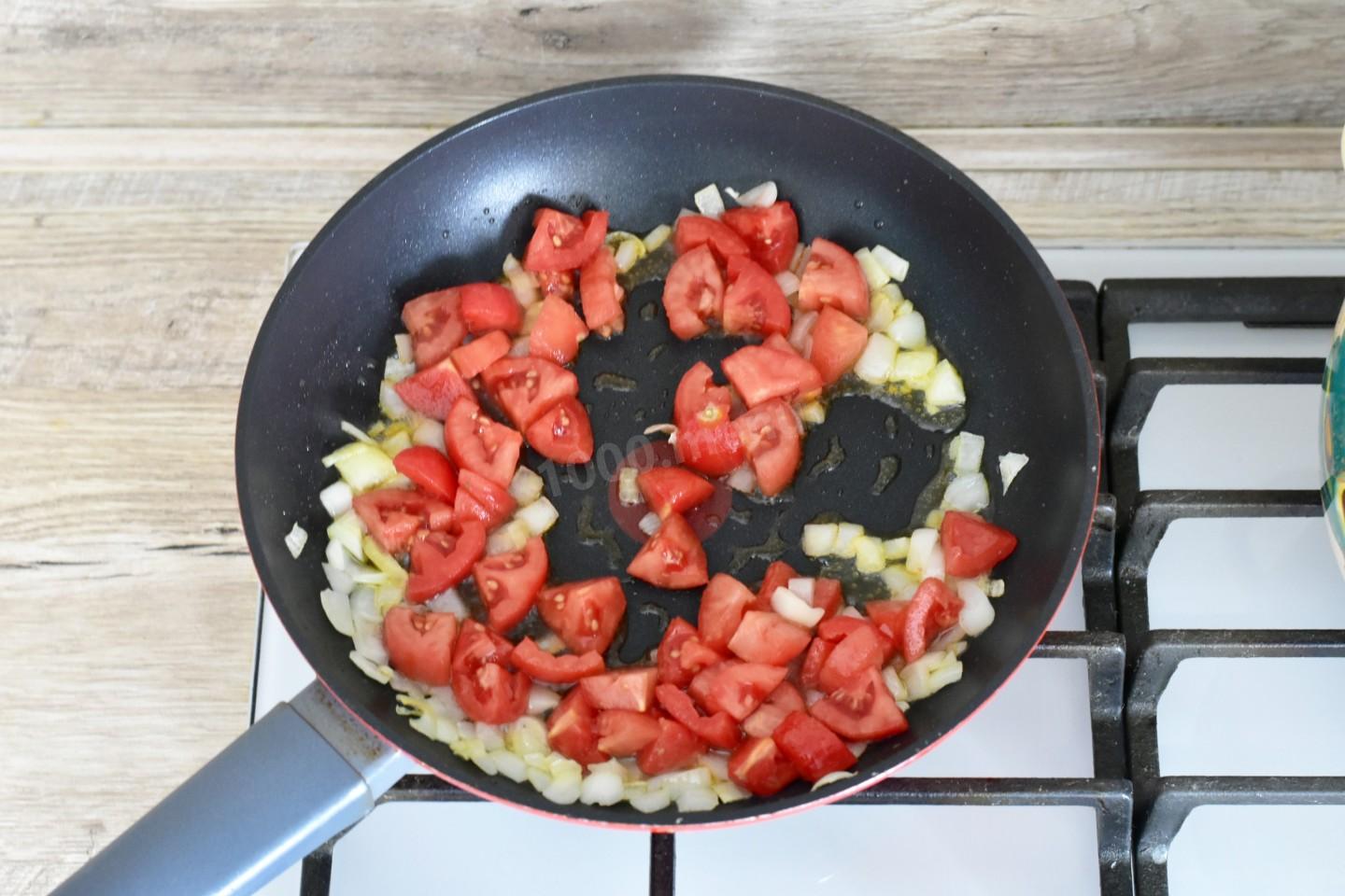 В сковороде на среднем огне разогрейте оливковое масло. Выложите лук и обжарьте, помешивая, до прозрачности. Добавьте в сковороду оставшиеся помидоры и тушите все вместе около 5 минут. О том, как подобрать идеальную сковороду и масло для жарки, читайте в статьях, ссылки в конце рецепта.