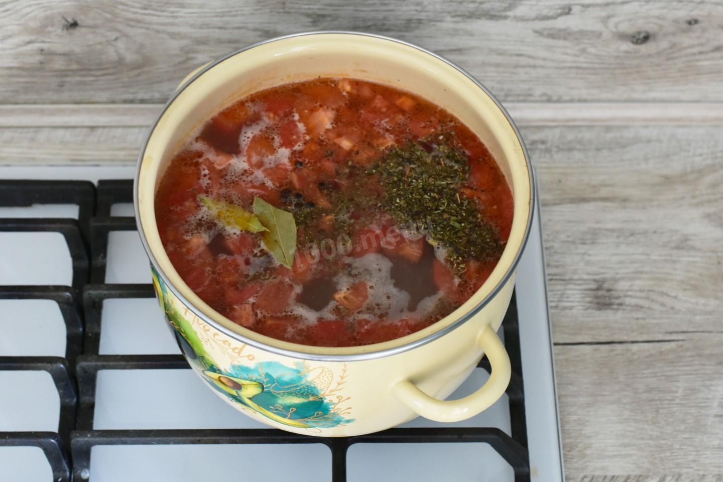 Переложите тушеные овощи в кастрюлю. Следом добавьте лавровые листья, сушеный базилик, хмели-сунели, соль и перец. Варите, помешивая, примерно 5-10 минут. В конце добавьте пропущенный через пресс или мелко нарезанный чеснок и рубленую петрушку. Уберите кастрюлю с огня, накройте крышкой и дайте супу настояться около 10 минут.