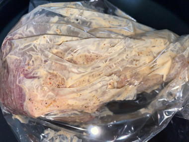 Завяжите края и хорошо встряхните, чтобы майонез распределился по всему рукаву. Положите рукав с бараниной на противень и уберите в холодильник на 5-6 (минимум 3) часов для маринования.