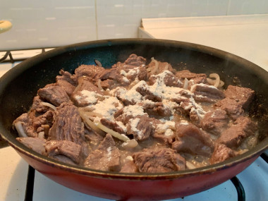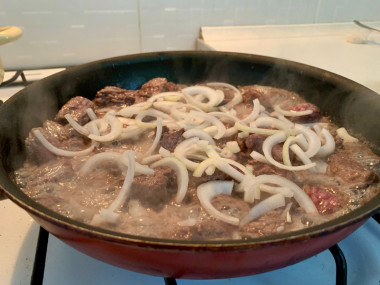 Луковицу очистите от шелухи и нашинкуйте тонкими полукольцами. Добавьте в сковороду и обжаривайте с мясом ещё пять минут. Лук в дальнейшем сыграет свою роль в формировании подливки. Огонь убавьте до среднего.