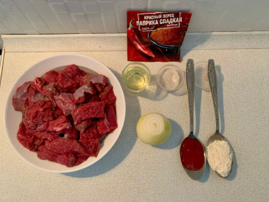 Как сделать гуляш из телятины с подливкой? Мясо необходимо достать из холодильника за полчаса до начала приготовления, дать ему отдохнуть при комнатной температуре. Так мясо примет более однородную структуру. Затем телятину вымойте и нарежьте на кусочки среднего размера. Мякоть необходимо резать поперёк волокон. Волокна - это параллельные тонкие мышечные полоски. Нож нужно ставить перпендикулярно этим полоскам. Мельчить здесь не нужно, это не бефстроганов.