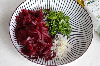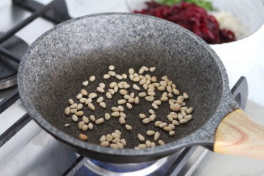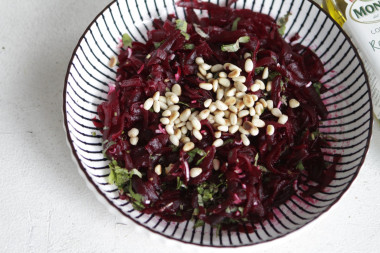 Очень бюджетный и вкусный салат из свеклы с кедровыми орешками.