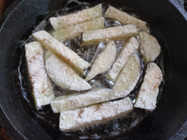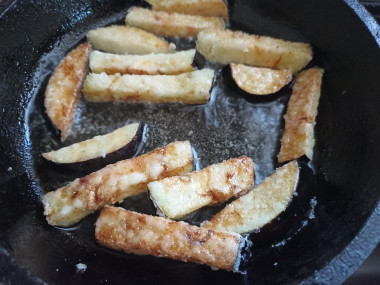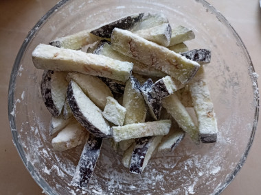 Хорошенько обваляйте баклажаны в крахмале, стараясь, чтобы каждый кусочек со всех сторон был покрыт крахмалом. Крахмал можете заменить на муку.