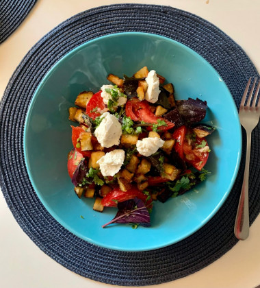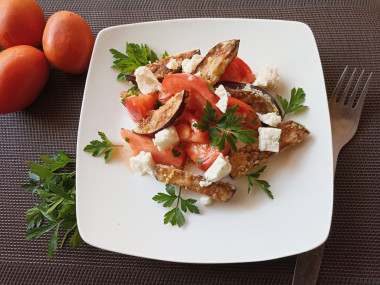 Заинтересовал рецепт теплого салата с хрустящими баклажанами помидорами и сыром.