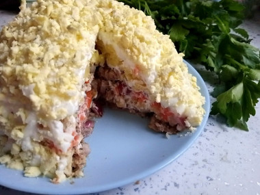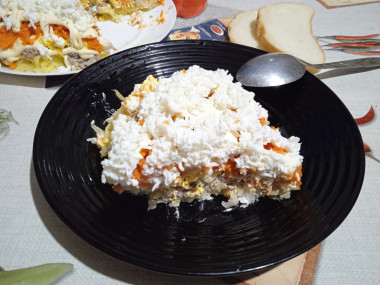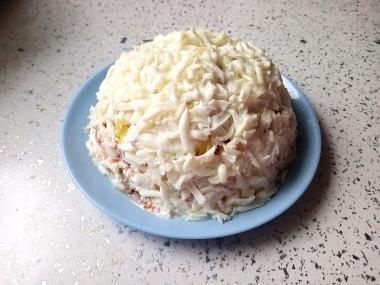 Перед подачей салат должен постоять в холодильнике, чтобы слои пропитались майонезом, и он не казался сухим. Приятного аппетита!