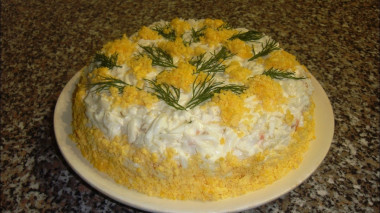 Спасибо за идею! Украсила салат "веточками мимозы", всем очень понравилось. Только ободок сделала желтенький, а не зеленый, как в оригинале. Посчитала, что укропа и без того будет достаточно, его у нас в доме любят , но без восторгов. В остальном, всё очень красиво и вкусно.