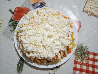 Отварную морковь очистите от кожуры и натрите на средней или крупной тёрке. Выложите равномерно натёртую морковь на слой с картофелем и майонезом. Сделайте майонезную сеточку.