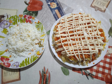 Также в качестве заправки можно использовать не только майонез, но и сметану или натуральный йогурт. Их можно взять по отдельности либо смешать с майонезом в любой пропорции на свой вкус - это снизит калорийность блюда.