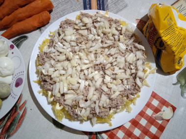 Для удобства майонез можно переложить в кондитерский мешок. Сделайте поверх слоя с луком майонезную сеточку. Можно не наносить сеточку из майонеза, а просто промазать им слой.