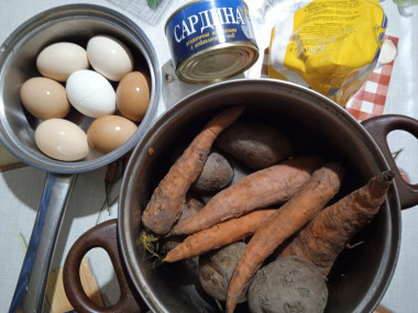 Калорийность продуктов: Сайра консервированная, Яйца, Картошка, Морковь, Лук, Укроп, Майонез