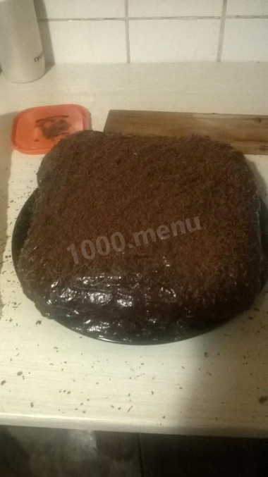 Разрежьте корж на три равных части, щедро промажьте их кремом и уложите друг на друга. Оставшимся кремом полейте сверху торт, распределив его по поверхности и по бокам.