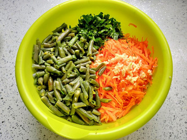 Для приготовления 8 порций салата нам понадобится грамм 600 спаржевой фасоли, обязательно зеленой и очень молодой, стручки должны быть сочные. А также берем 300 грамм моркови, 4-5 зубчиков чеснока, пакетик на 20 г смеси специй моркови по-корейски, пол чайной ложечки соли, 2 ст. ложки сахара, 2 ст. ложки столового уксуса, 5 ст.ложек подсолнечного масла и пучок зелени – укроп с кинзой. Стручки фасоли и зелень моем, морковку и чеснок очищаем.