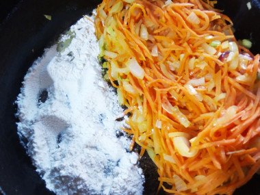 Затем всыпаем в кастрюлю муку, хорошенько перемешиваем и тушим еще минут 10, помешивая.