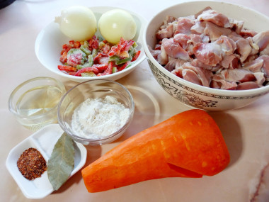 По указанному списку подготовим необходимое количество продуктов на 4 порции готового гуляша. Куриные желудки промываем под холодной водой, если попадается внутренняя пленка, удаляем ее. Лук и морковь чистим, сладкий перец освобождаем от семян.