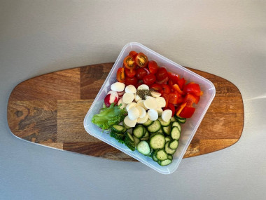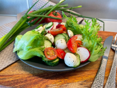Мне на вкус этот салат очень понравился, т.к. в нем не было ярко выделяющегося вкуса, а свежие и хрустящие овощи очень гармонично дополняются довольно нейтральным, но в тоже время нежным и сливочным вкусом моцареллы.