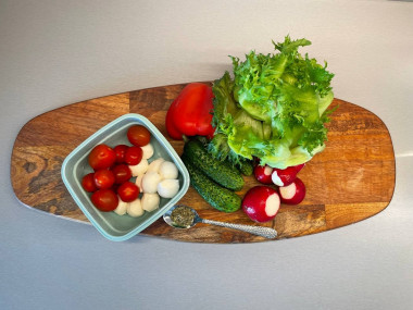 Сезон овощей в самом разгаре, поэтому решила приготовить салат из свежих огурцов и помидоров с моцареллой.