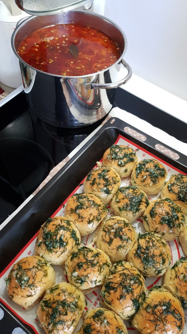 В первый раз решила не покупать, а сделать самой. Рецепт Украинские пампушки с чесноком к борщу в духовке на дрожжах не сложный, выпечка такая ароматная, с борщецом...ммм. Спасибо за рецепт!)