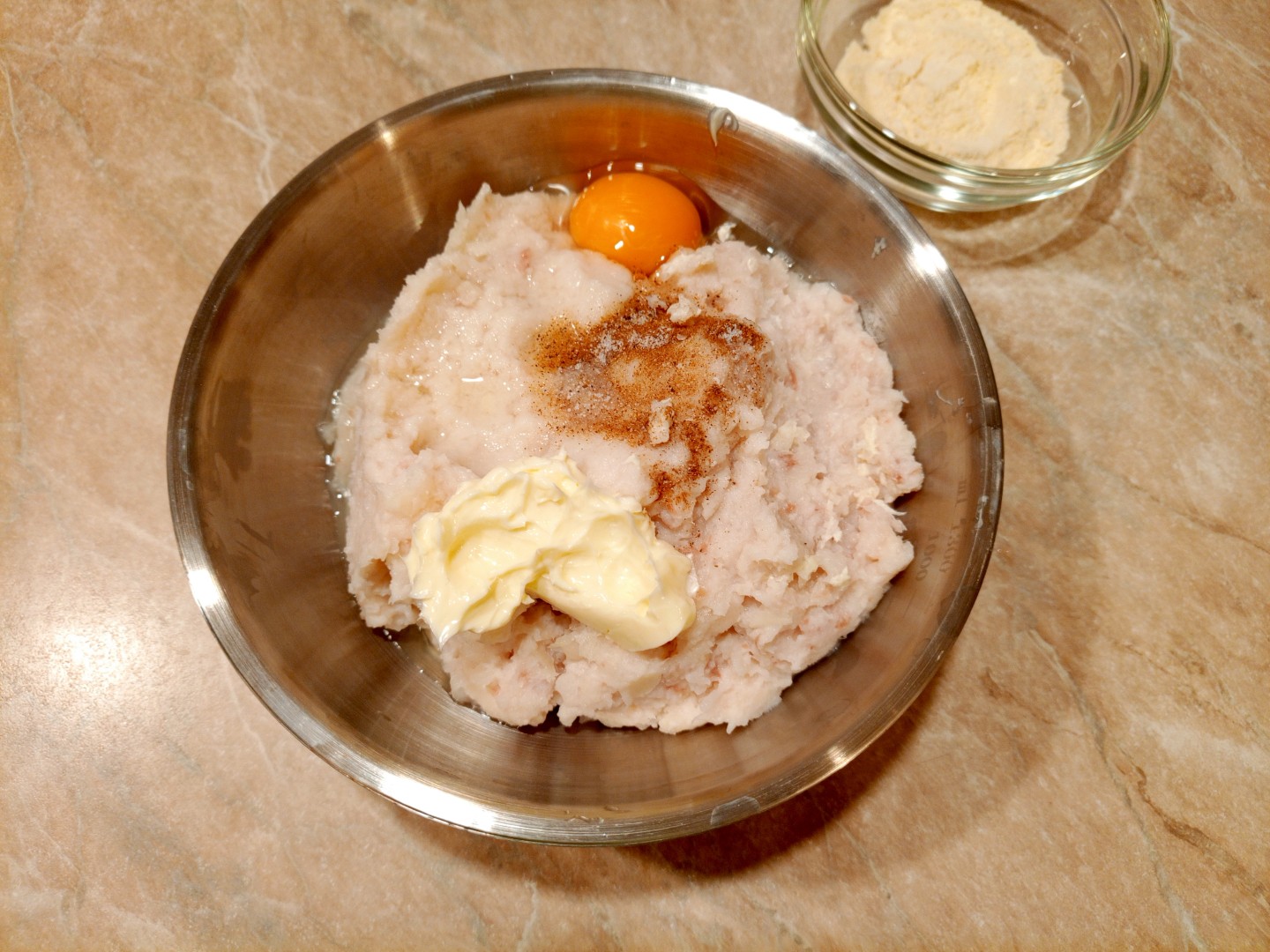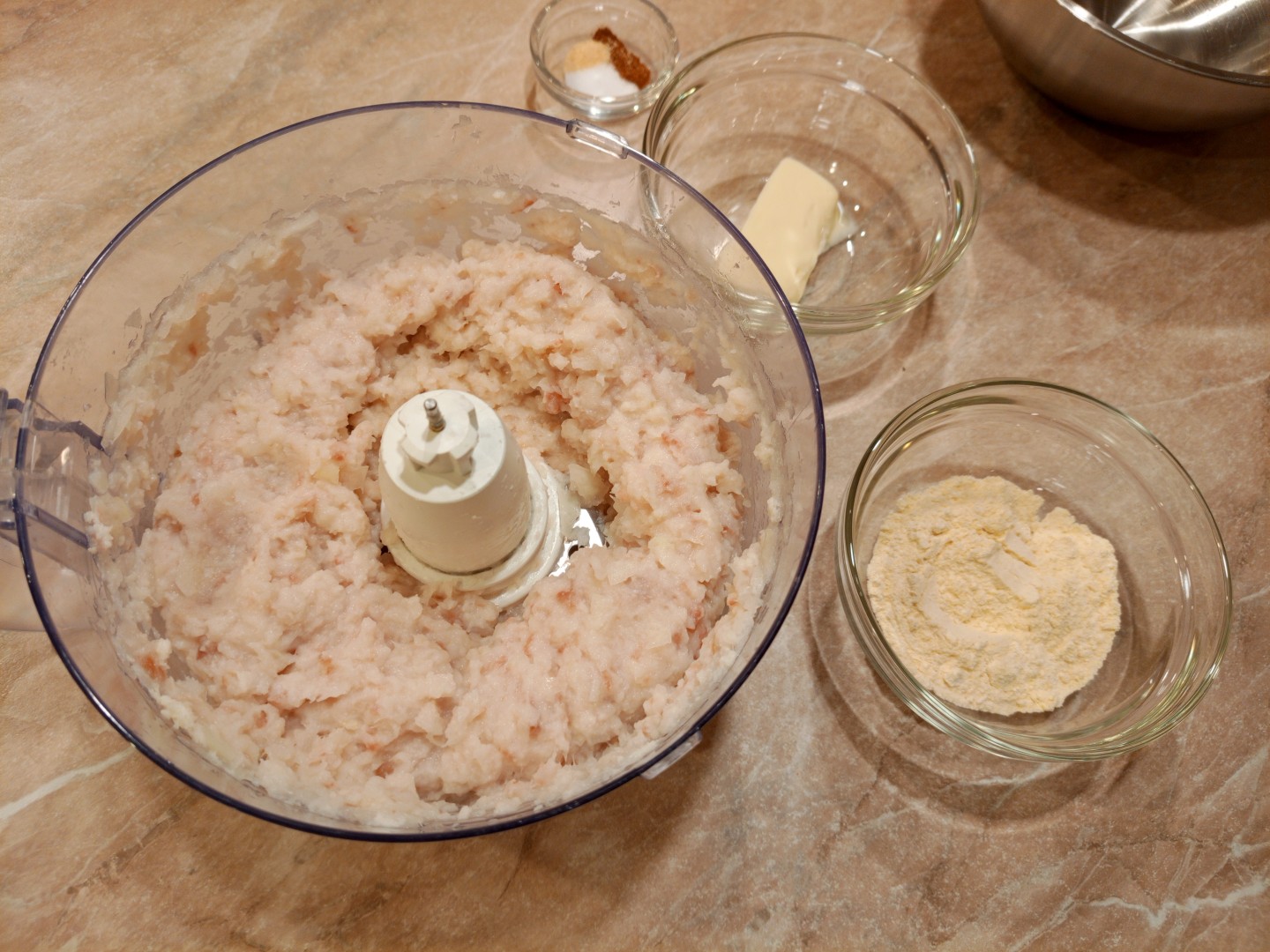 Работала с замороженным филе в брикетах, поэтому взяла его чуть больше на всякий случай. Хлеб и молоко тоже увеличила пропорционально, хлеб использовала чуть подсушенный. Замены были минимальные: брала смесь четырёх перцев вместо чёрного, а чеснок добавила сушёный, потому что свежего не оказалось под рукой.